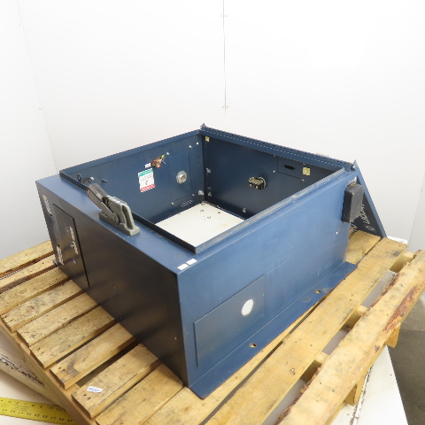 - Features a large blue steel enclosure with a hinged top lid