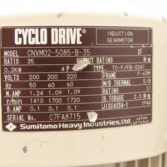 Sumitomo CNVM02-5085-B-35 35:1 Ratio Cyclo Drive Gearmotor 0.2kW 200/220V