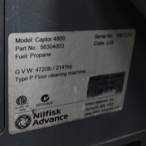 Advance Nilfisk Captor 4800 LPG Ride On Floor Sweeper Scrubber 62" Sweep 1970Hrs