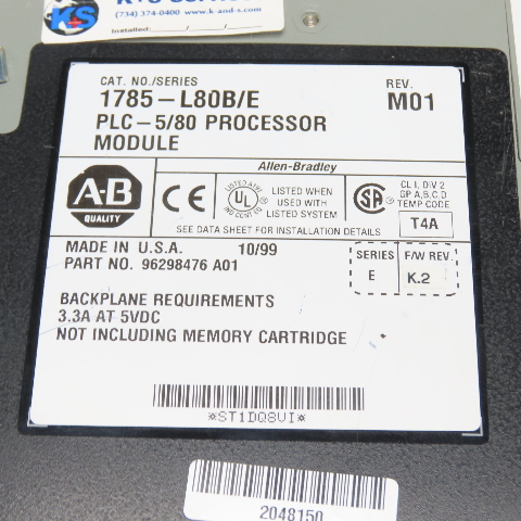 Allen-Bradley 1785-L80B/E PLC 5/80 Processor Module M01 F/W Rev K2