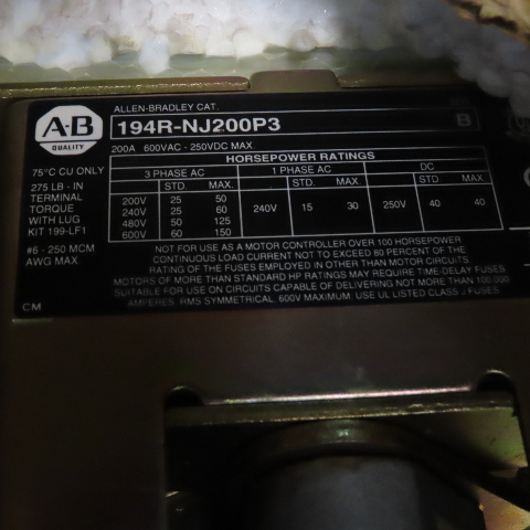 Allen-Bradley 194R-NJ200P3 200A 3-Pole Fusible Safety Disconnect Switch 600VAC