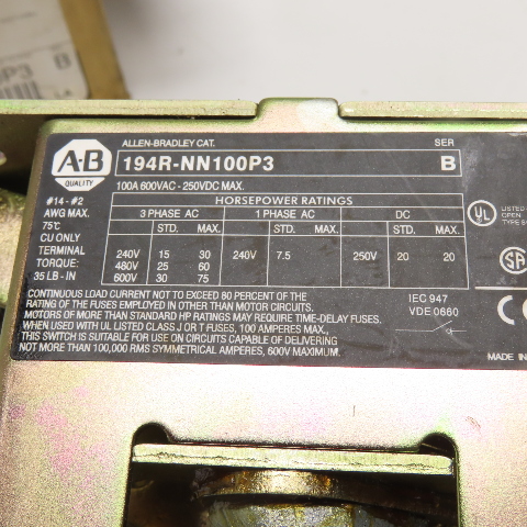 Allen-Bradley 194R-NN100P3 100A 3-Pole Non-Fusible Safety Disconnect Switch 600V