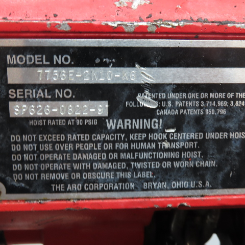 ARO 7756E-2K10-K6 1/2 Ton Air Chain Hoist 10' Travel Pendant Operated