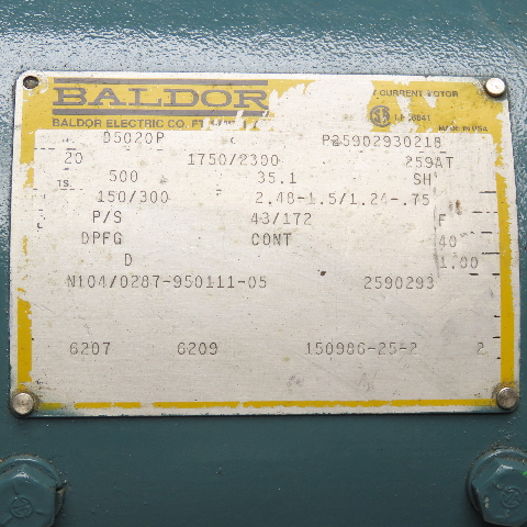 Baldor D5020P 20Hp 1750/3000RPM 500V DC Armature 259AT Frame DC Motor