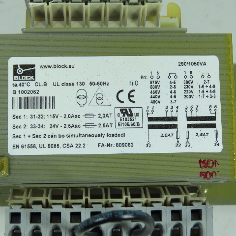 Block B1002062 290/1050VA Control Transformer 380-600V Primary 115V/24V Sec