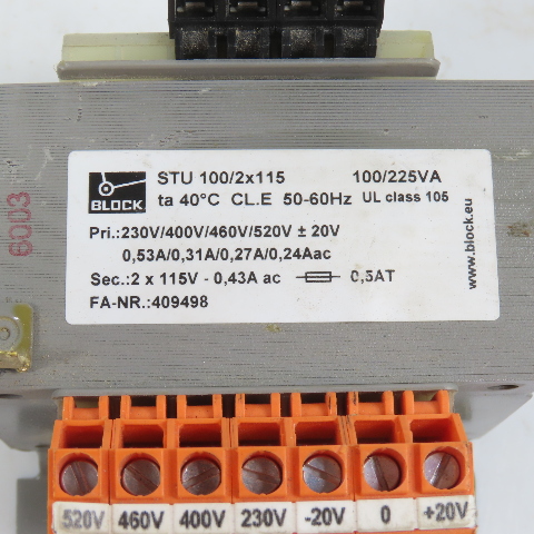Block STU 100/2x115 100/225VA Control Transformer Pri 230-460/520V Sec 115V