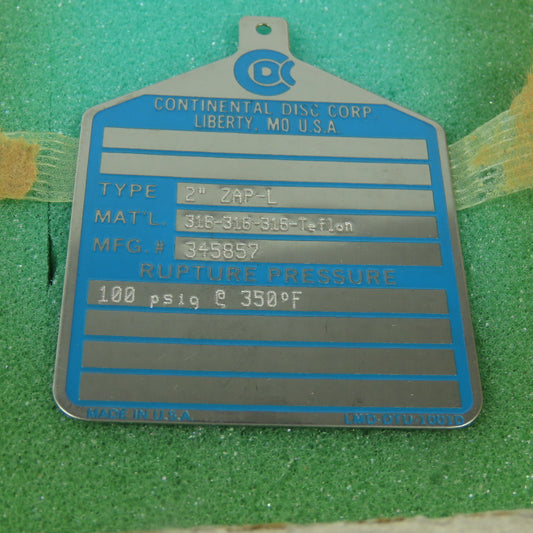 Continental Disk ZAP-L 2" Rupture Disk 316-316-316-Teflon 100 PSIG @350°F