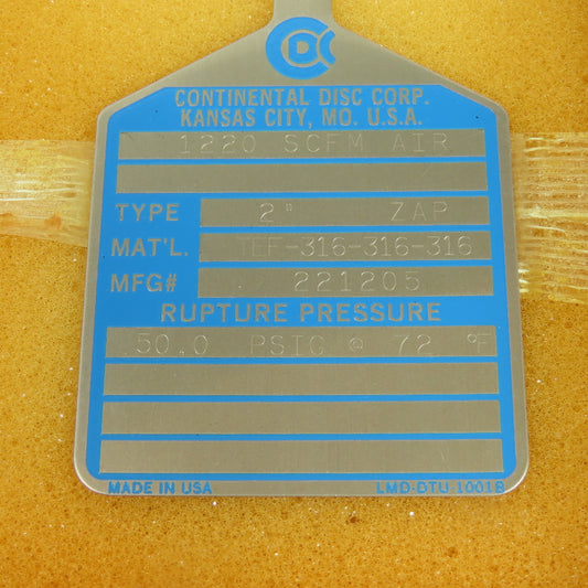 Continental Disk ZAP-L 2" Rupture Disk TEF-316-316-316 50.0 PSIG @ 72°F