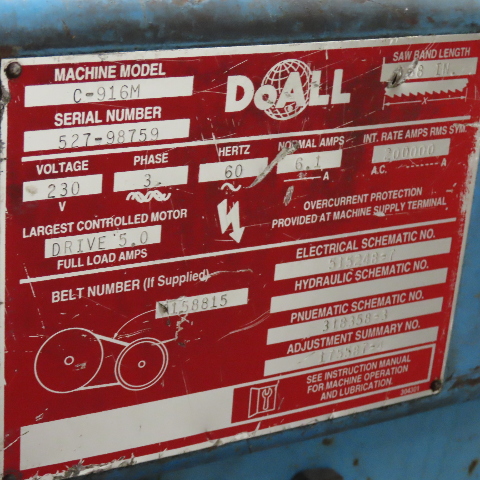 DoAll C-916M 9" x 16" Horizontal Band Saw Variable Speed 208-480V 3Ph