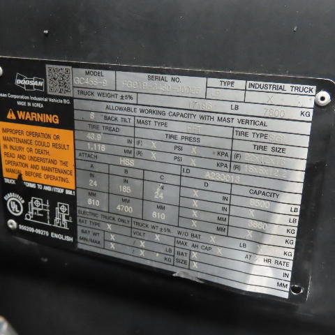- Doosan GC45S-9 LP powered forklift