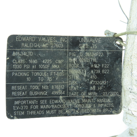 Edward 02601718 36124F22 Univalve Forged Steel Stop Valve Size .75" Class 1690