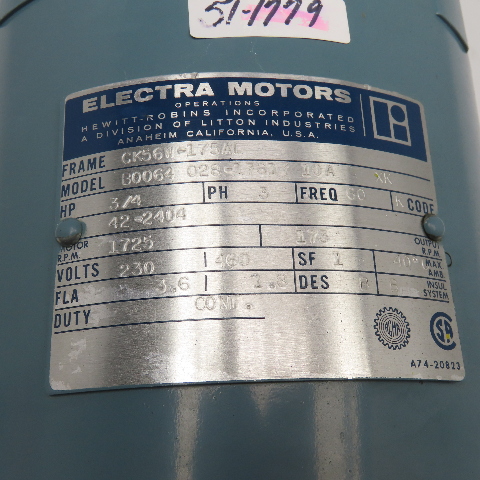 Electra Motors 10:1 Ratio 3/4Hp 230/460V 3Ph RH 173RPM Output Gear Motor