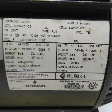 Emerson 4LX26 H17443 15HP Electric Motor 230/460V 1770RPM 254T Frame Tested