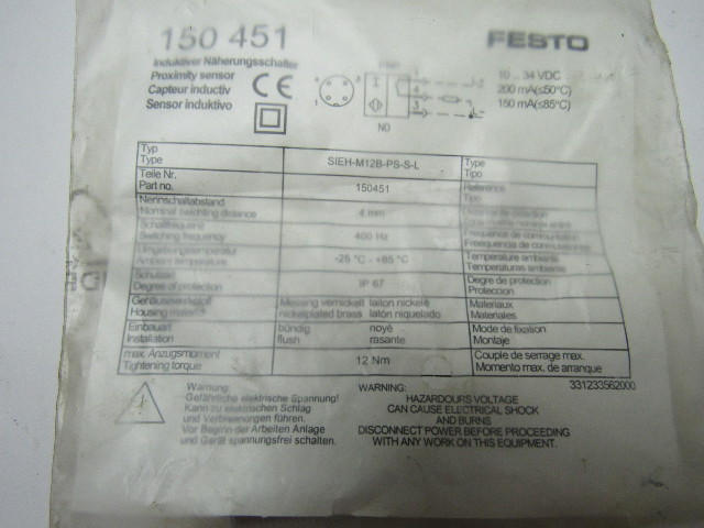 Festo SIEH-M12B-PS-S-L Stainless Steel Inductive Proximity Sensor 10-30VDC