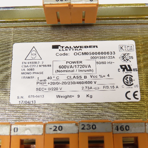 Italweber OCM0500600633 0-600V Primary 0/220V Sec. 600VA 1Ph Transformer