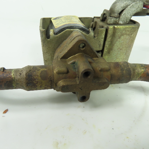 - The valve includes two copper pipe segments and shows heavy patina and wear consistent with used HVAC service.
