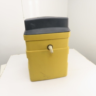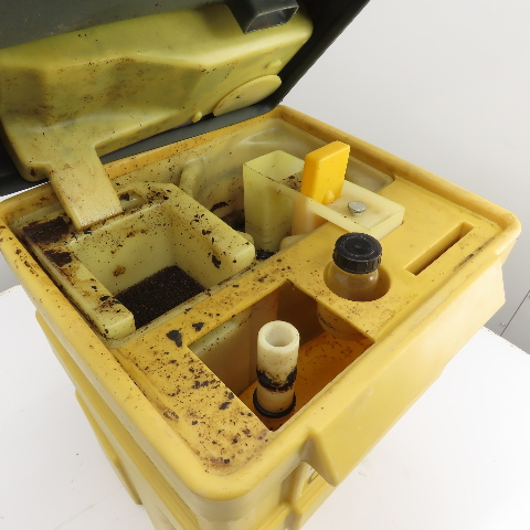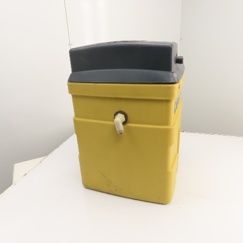 - Yellow polyethylene housing shows dirt accumulation and surface wear consistent with industrial use
