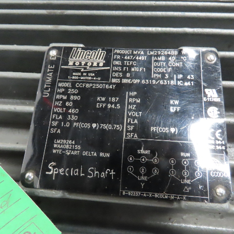 Lincoln CCF8P250T64Y 250HP Electric Motor 460V 3Ph 890RPM 447/449T Frame 330A