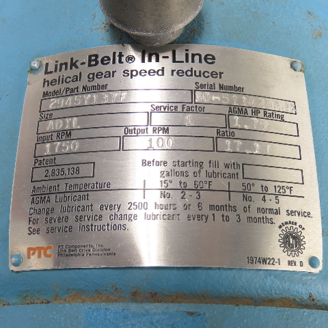 Link-Belt 2945Y137F In-Line Helical Gear Speed Reducer 1.78HP 17.1 Ratio