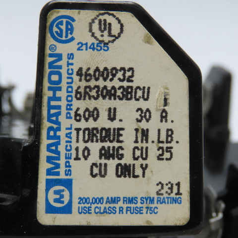 Marathon 6R30A3BCU 600V 30A 3 Pole Class R Fuse Holder Lot Of 3