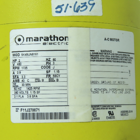 Marathon Electric 5K49UN8161 2HP 3Ph Electric Motor 1725RPM 460V 56CY Frame