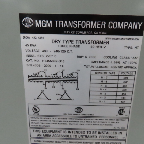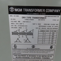 MGM HT45A3K2-D16 480V Primary 45kVa 240/120V Secondary 3Ph Transformer