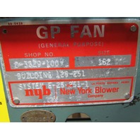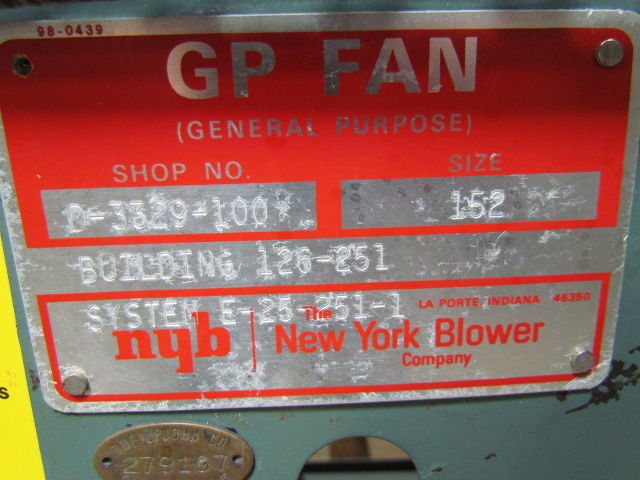 16-1/2" OD Inlet. 8-7/8" x 16-13/16" Outlet. Backward Inclined Aluminum Wheel (PLR). 3HP 3Ph 208-230/460V. Shop No. 3329-100. Building No. 126-251. System No. E-25-251-1. Tested & Runs As It Should.