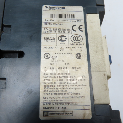 Schneider Electric LC1D40 3-Pole Contactor 60A 600VAC 24VDC Coil