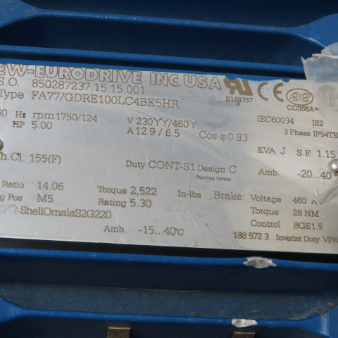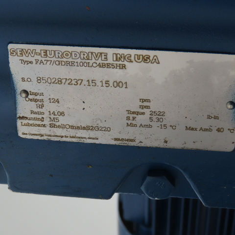 Sew FA77/GDRE100LC4BE5HR 14.06:1 Ratio 124RPM Gear Motor 5Hp 230/460V W/ Brake