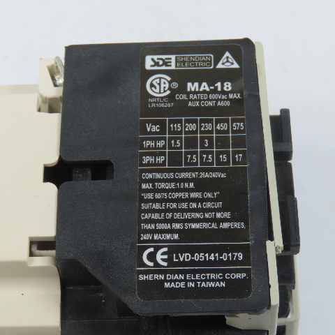 Shern Dian MA-18 26A 600VAC Magnetic Contactor 17HP 220/240VAC Coil