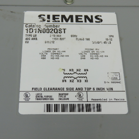 Siemens 1D1N002QST 2KVA Transformer 240/480V Pri 120/240V Sec 1PH