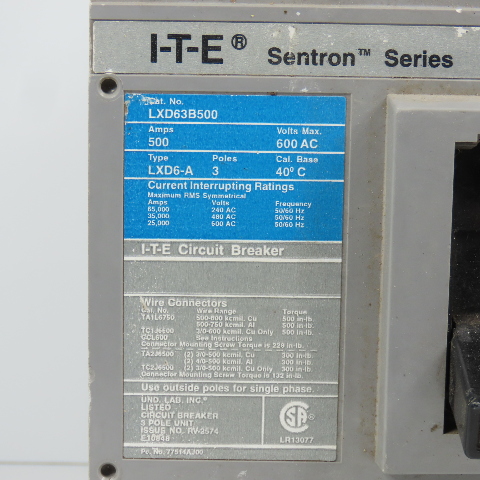 Siemens LXD63B500 LXD6-A I-T-E Sentron 500A 3-Pole Circuit Breaker 600VAC Max