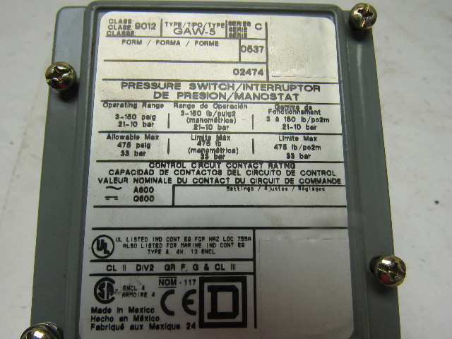 Square D 9012 GAW-5 Series C Adjustable Pressure Switch