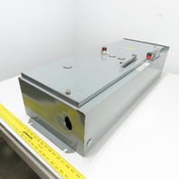- The unit features an external disconnect handle, a small terminal strip, and an added red indicator light on the door.