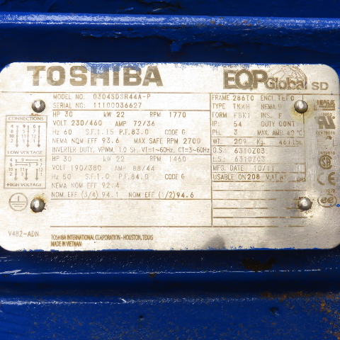 TOSHIBA 0304SDRSR44A-P 30HP Electric Motor 230/460V 1770RPM 286TC Frame Tested