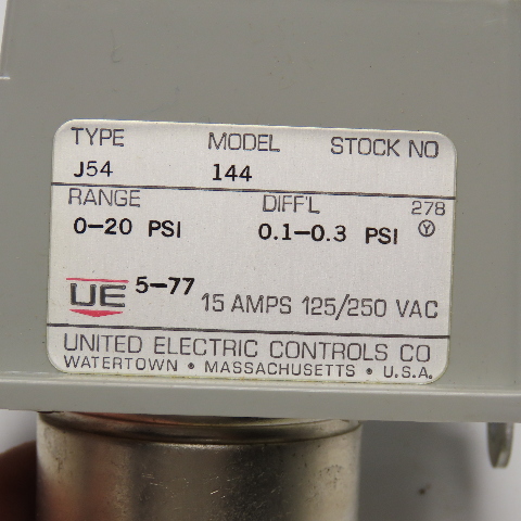 United Electric J54 Model 144 Pressure Switch 0-20PSI 125/250VAC 0.1-0.3PSI Diff