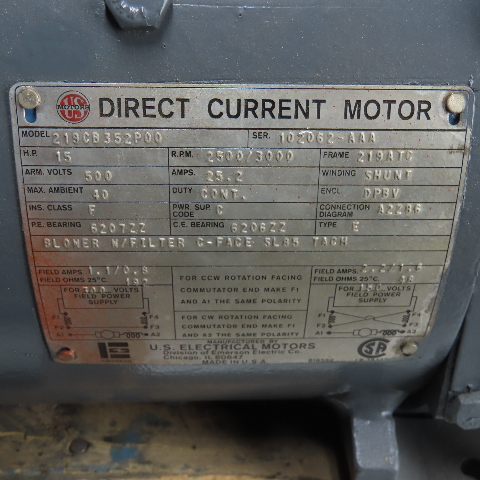 U.S. Electrical Motors 219CB352P00 15HP DC Electric Motor 2500/3000RPM 500V