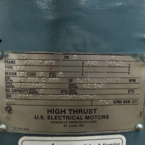 U.S. Electrical Motors RU 125HP High Thrust Vertical AC Motor 460V 3Ph 405TP