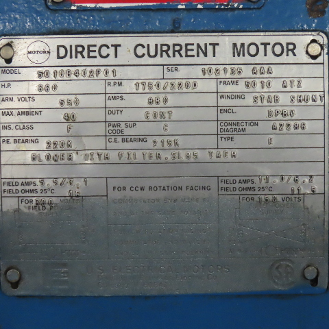 U.S. Motors 5010B402P01 660HP 550VDC Motor 1750/2200RPM 5010 ATZ Frame See Info