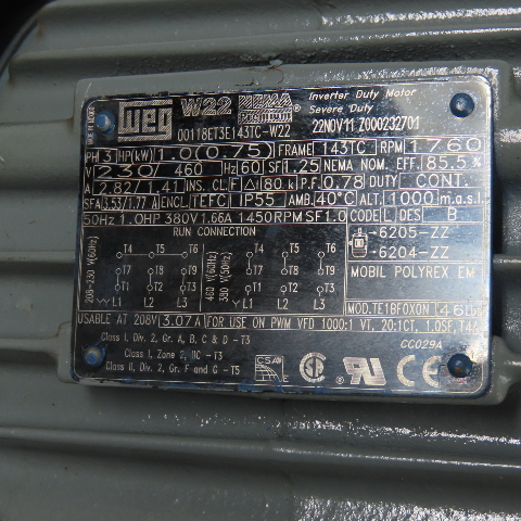 WEG 00118ET3E143TC-W22 1HP Electric Motor 1760RPM 230/460V 3Ph 143TC Frame