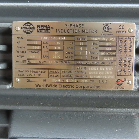 WorldWide PEWWE15-36-254T 15HP Electric Motor 3540RPM 230/460V 3Ph 254T Fr. New