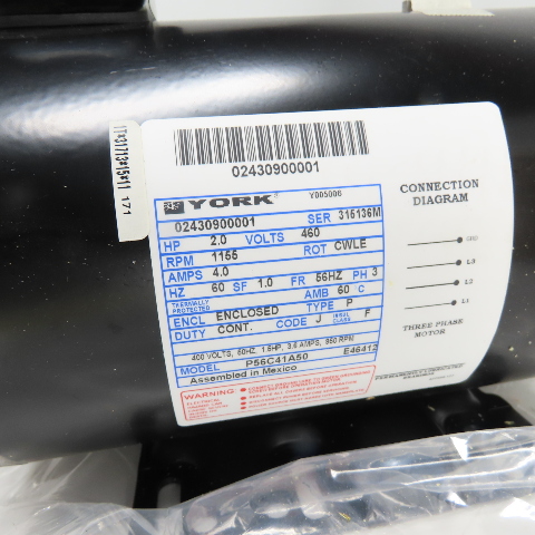 York 024-30900-001 2HP Fan Motor 460V 3Ph 1155RPM 56HZ Frame NEW